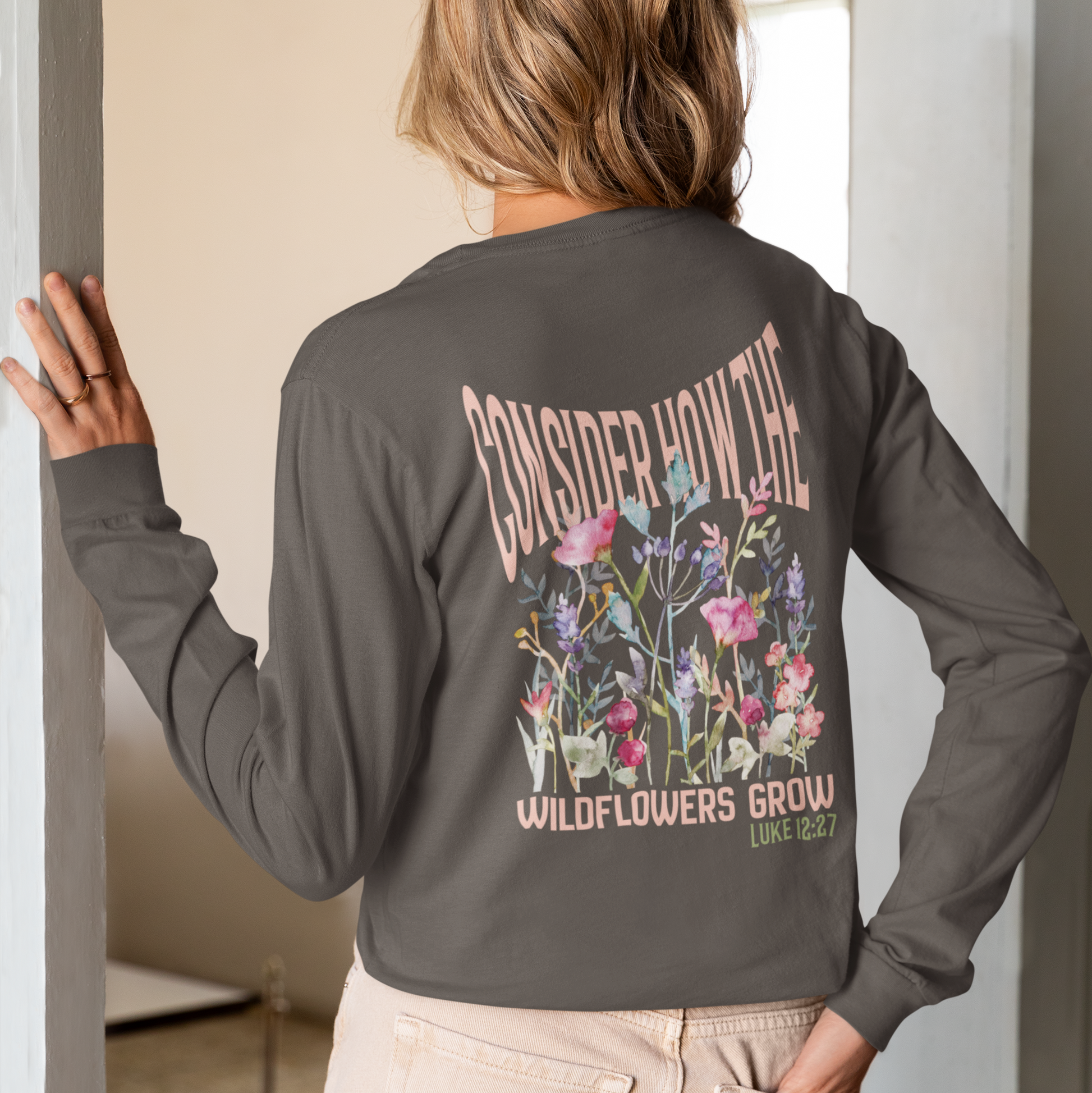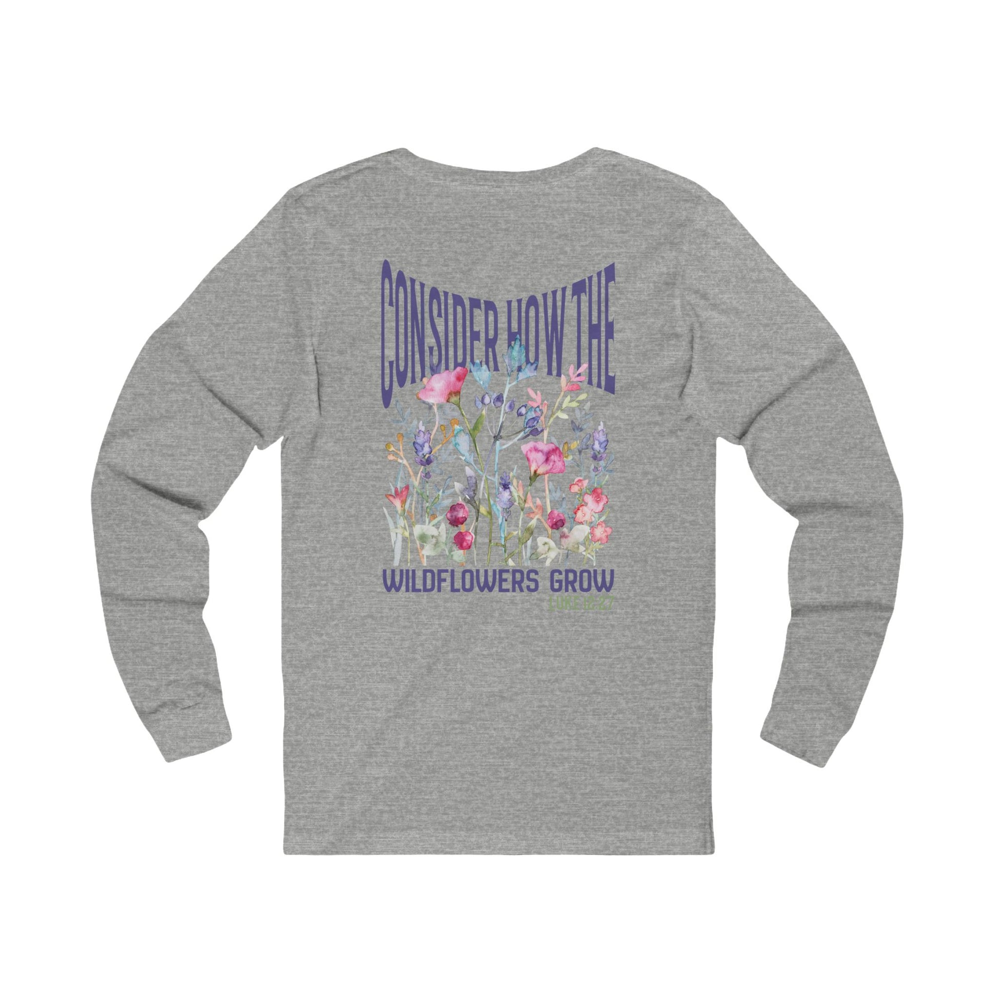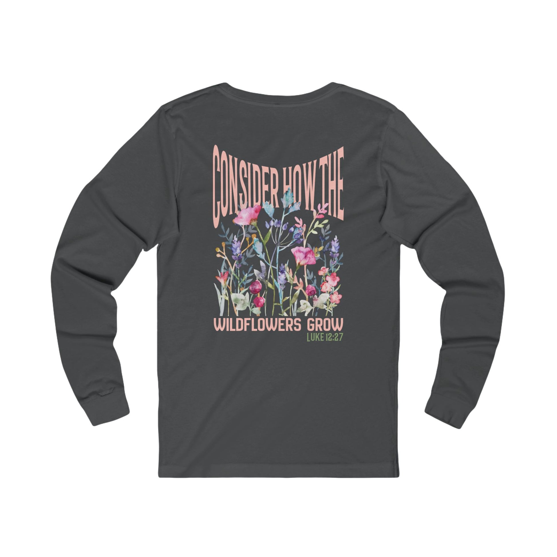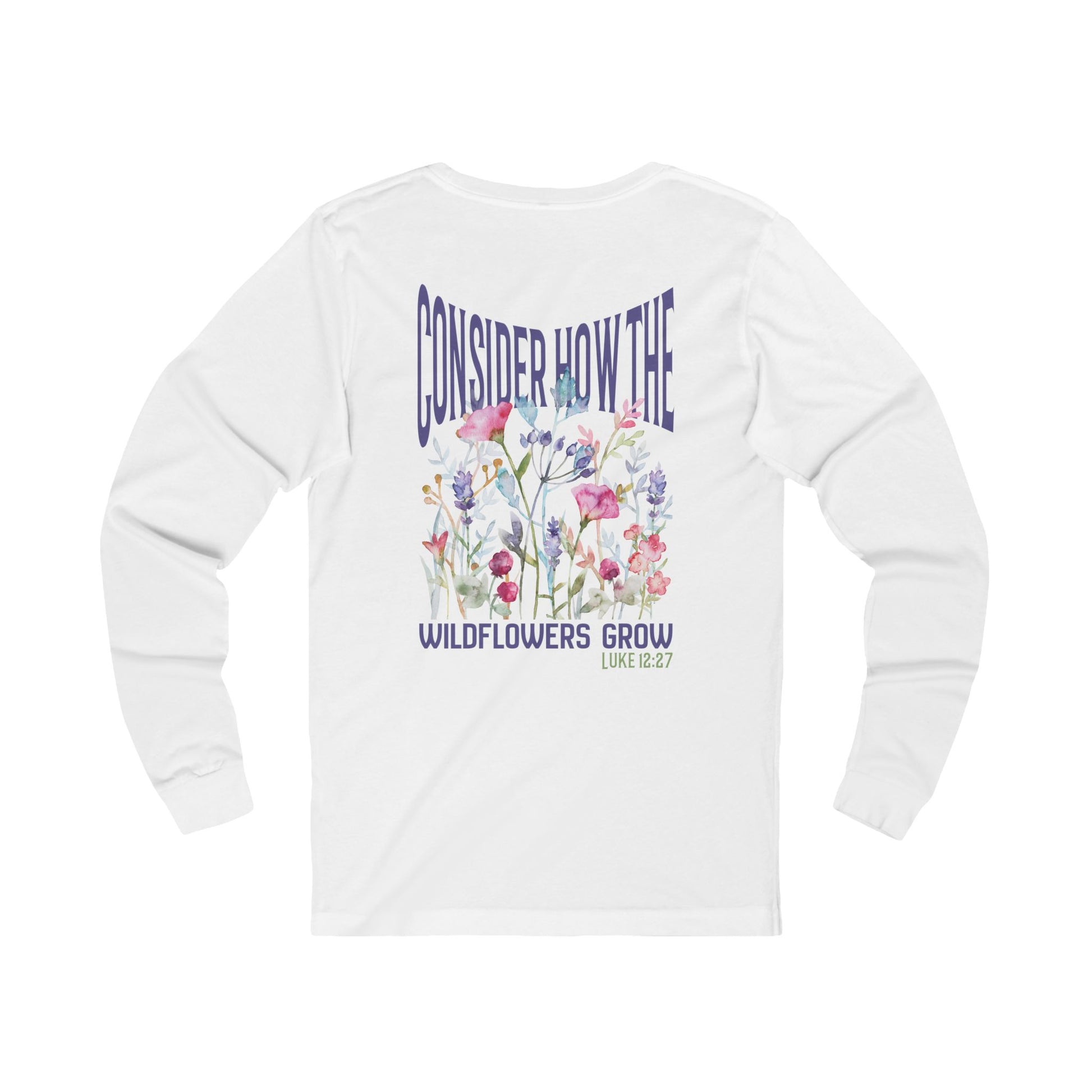 Consider How The Wildflowers Grow Long Sleeve, Bible Verse Floral Design, Christian Faith Inspired Long Sleeve Tee For Women