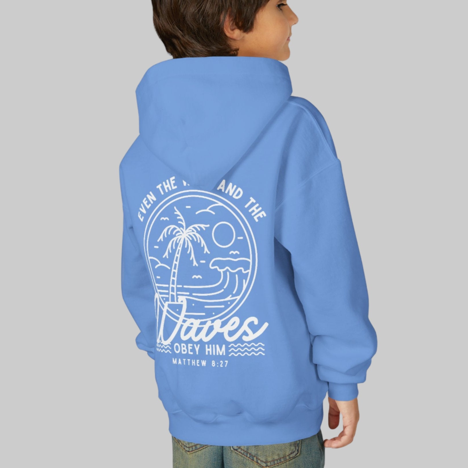 Youth 'Even The Wind And The Waves Obey Him' Bible Verse Hoodie, Beach Vibes Kids Hooded Sweatshirt, Faith-Inspired Teen Hoodie